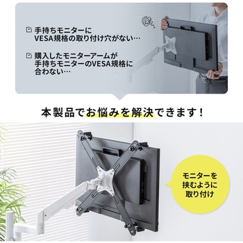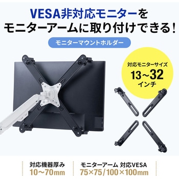 VESA規格の取り付け穴がないモニターを、モニターアームに固定できるホルダー部品です。13~32インチまでの幅広いサイズに対応し、家庭用からビジネス用途まで幅広く活躍します。対応厚さ10~70mmで、さまざまなモニターにフィットしやすく、安定した設置が可能です。簡単に取り付けできる設計で、誰でも手軽にモニター環境をアップグレードできます。
