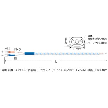 RoHS2適合品常用限度:250℃、許容差:クラス2(±2.5℃または±0.75%)線径:0.32mm熱電対素線にガラスなどの被覆を施したもので、保護管などには入れずそのまま使用する熱電対です。K熱電対なので、デジタル温度コントローラ monoOne-120/200の他、市販の温度調節器にも対応可能です。