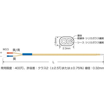 RoHS2適合品常用限度:400℃、許容差:クラス2(±2.5℃または±0.75%)線径:0.32mm熱電対素線にガラスなどの被覆を施したもので、保護管などには入れずそのまま使用する熱電対です。K熱電対なので、デジタル温度コントローラ monoOne-120/200の他、市販の温度調節器にも対応可能です。