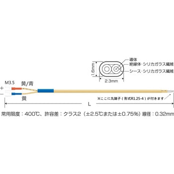 RoHS2適合品常用限度:400℃、許容差:クラス2(±2.5℃または±0.75%)線径:0.32mm先端に丸端子が付いたものです。熱電対素線にガラスなどの被覆を施したもので、保護管などには入れずそのまま使用する熱電対です。K熱電対なので、デジタル温度コントローラ monoOne-120/200の他、市販の温度調節器にも対応可能です。