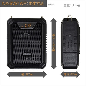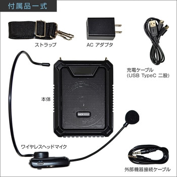 付属品本体・ワイヤレスヘッドマイク・ACアダプタ・ストラップ・USB Type-C 二股充電ケーブル・3.5mm外部機器接続ケーブル・取扱説明書(保証書付)質量(g)315使用温度範囲(℃)-10 ~ +45電源内蔵リチウムイオン電池 2500mAh最大出力(W)18寸法(幅W×高さH×奥行D)(mm)97×125×45(突起除く)入力【マイク】3.5mm連続使用時間マイク:10~12時間、音楽:6~8時間(音量約50%時)周波数特性90Hz ~ 18,000Hz充電時間約 3~4時間対応メディアマイクロSDカード、USBメモリー(最大32GB) mp3形式スピーカー密閉式フルレンジスピーカー外部入力3.5mm (AUX)スピーカー部インピーダンス(Ω)2内容量1個