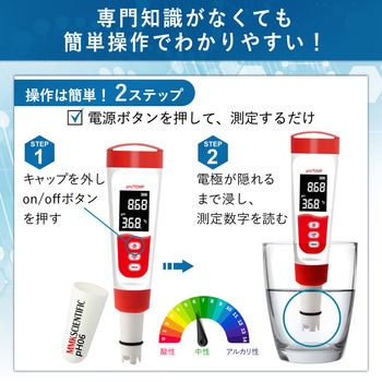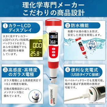 【防水・防塵性能 IP65】粉塵の侵入を防ぎあらゆる方向からの噴流水にも耐える設計です。 【自動温度補正機能(ATC)】正確なpH測定に必要な自動温度補正機能(ATC)付きです。 【電極保護用スポンジキャップ】キャップ内部のスポンジに電極保存液を浸すことで、電極の乾燥を防止します。 【リセット機能搭載】万が一動作が不安定になった場合でも、復旧が可能です。
