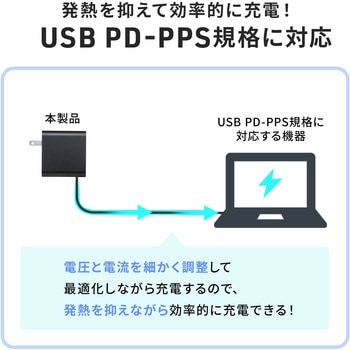 USB PD-PPS規格の出力に対応し、PPS規格対応機種の充電においては充電中の電圧と電流を細かく調整し最適化することで、発熱を抑えながら効率的に充電することができます。