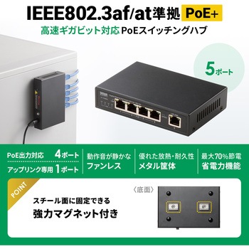 IEEE802.3at(PoE+)に対応し、底面マグネットによりスチール面への固定に対応したコンパクトなギガビット通信対応PoEスイッチングハブ。
