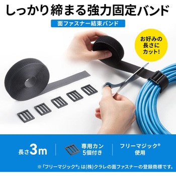 1本のテープにフックとループの両機能を備えた「フリーマジックR」で、どの面同士でもしっかり接着できます。向きを選ばず固定できるため、配線やケーブル、小物の結束など、幅広い用途で活躍します。専用カンが5個付属しており、テープを好みの長さにカットして、必要な分だけバンドとして使えます。繰り返し使える面ファスナー素材で、工具不要。整理や収納の効率を高めたい場面に最適です。幅25mm・長さ3mの使いやすいサイズで、家庭・オフィス・現場など多様なシーンに対応します。