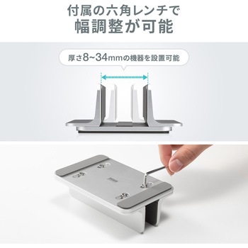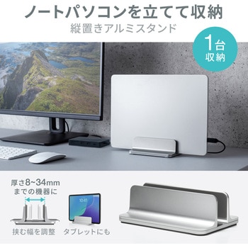 ノートパソコンの内蔵ディスプレイを閉じた状態で外部ディスプレイなどと接続して使う際に便利な縦置きタイプのアルミスタンドです。