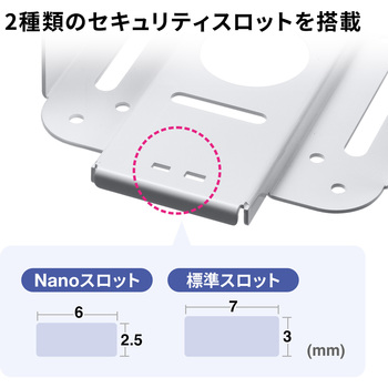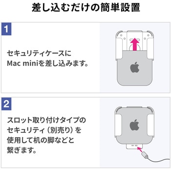Mac miniを本体に差し込み、別売りのセキュリティワイヤーで固定するだけの簡単設置です。(3×7mm標準、2.5×6mmNanoスロット対応)