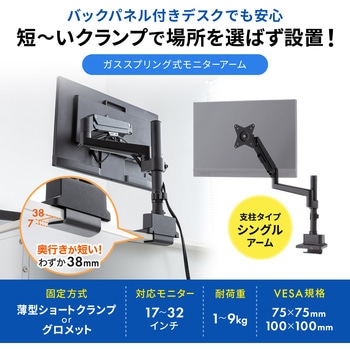 わずか奥行き38mmの薄型ショートクランプタイプのモニターアーム。支柱タイプで幅広い高さ調節が可能。ガススプリング式。