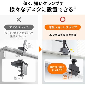 クランプ金具の奥行きがわずか38mmの薄型ショートクランプタイプなので、バックパネルのあるデスクにも取付けしやすくなっています。