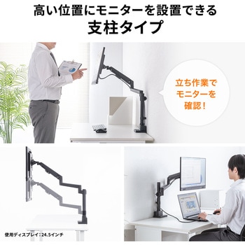 支柱にガススプリング式アームを取り付けるタイプなので、高さ調整の自由度が高く、通常のガススプリング式モニターアームに比べ、より高い位置にモニターを設置できます。ノートPCやモバイルモニターとの上下での設置のような使い方にも便利です。