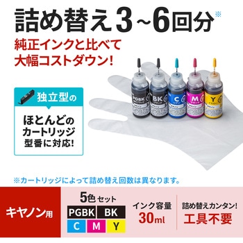 セット内容手袋×1組種類インクのみ※工具なしで詰替できます。内容量(mL)各30インク色顔料ブラック、ブラック、シアン、マゼンタ、イエロー詰替方式点下方式対応カートリッジXKI-N21 M、XKI-N21 C、XKI-N21 BK 、XKI-N20 PGBK、XKI-N11Y、XKI-N11XLY、XKI-N11XLM、XKI-N11XLC、XKI-N11XLBK、XKI-N11M、XKI-N11C、XKI-N11BK、XKI-N10PGBK、BCI-381Y、BCI-381XLY、BCI-381XLM、BCI-381XLC、BCI-381XLBK、BCI-381sY、BCI-381sM、BCI-381sC、BCI-381sBK、BCI-381M、BCI-381C、BCI-381BK、BCI-381+380/5MP、BCI-380XLPGBK、BCI-380sPGBK、BCI-380PGBK、BCI-371Y、BCI-371XLY、BCI-371XLM、BCI-371XLC、BCI-371XLBK、BCI-371M、BCI-371C、BCI-371BK、BCI-371+370/5MP、BCI-370XLPGBK、BCI-370PGBK、BCI-351Y、BCI-351XLY、BCI-351XLM、BCI-351XLC、BCI-351XLBK、BCI-351XL+350XL/5MP、BCI-351M、BCI-351C、BCI-351BK、BCI-350XLPGBK、BCI-350PGBK、BCI-331XL Y、BCI-331XL M、BCI-331XL C、BCI-331XL BK、BCI-331 Y、BCI-331 M、BCI-331 C、BCI-331 BK、BCI-330XL PGBK、BCI-330 PGBK、BCI-301 Y、BCI-301 M、BCI-301 C、BCI-301 BK、BCI-300 PGBK内容量1セット