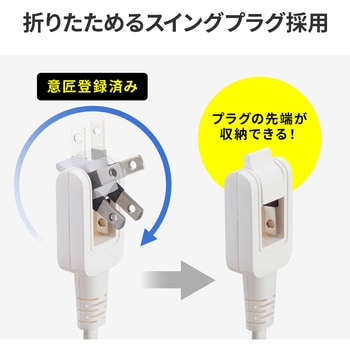 プラグ先端部分が270度折り曲がる構造の折りたたみ式スイングプラグを採用したタップです。プラグの金属部分が収納できるので、持ち運び時に他の機器を傷つけることもなく、安全に使えます。