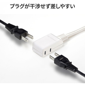 プラグが干渉せず差しやすい2個口仕様です。タップの上面・側面に差込口がレイアウトされており、プラグが互いに干渉しにくいので、無駄なく差すことができます。