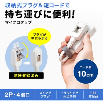 オリジナルの収納式スイングプラグで、持ち運びに便利なモバイルタップ。2P・4個口・0.1m。