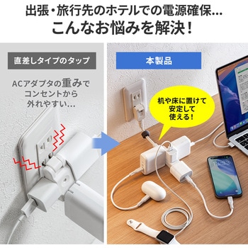 ケーブル長は10cmと短く、持ち運びに便利なモバイル用タップです。