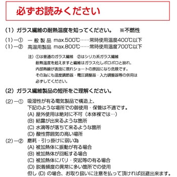 配管、バルブ、ポンプなどの形状が複雑なものに巻き付けて、加熱、保温するための帯状ヒーターです。リード線1m付、エキスパートスタッフによる丁寧な仕上げ、加工です。RoHS2適合品常用限度450℃/耐熱温度700℃※初期使用時に、煙が出る商品です。製品をはじめてご使用になる際には、煙が出て焦げた茶色に変色することがありますが、これはガラス布を織り上げるときにすべりを良くするためにつけられた有機系パウダーが熱により燃焼する現象で、初期使用時のみですのでご心配はいりません。