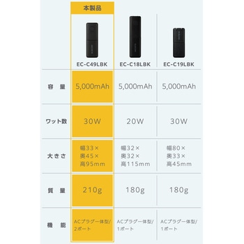 付属品絶縁シール×1色ブラック質量(g)210規格電気用品安全法/○PSE 特定以外の電気用品、◇PSE 特定電気用品出力【1】[AC充電器として使用時]USB Type-C1ポート【2】[モバイルバッテリーとして使用時]USB Type-C1ポート使用温度範囲AC充電器として使用時コネクタ形状電源出力側/USB Type-Cポート×1、USB-Aポート×1対応機種iPhoneおよびUSB端子で充電するスマートフォン、タブレット、パソコン、他小型電子機器定格容量電池:3.6V/5000mAh 18Wh外形寸法(幅W×奥行D×高さH)(mm)約33×45×95充電時間コンセントから直接充電電池充電式リチウムイオン電池保証期間1年間定格入力電圧・電流/AC入力繰り返し使用500回内容量1個