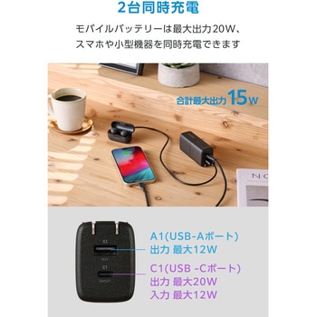 USB Type-C(TM)ポート×1、USB-Aポート×1を搭載。スマートフォンとワイヤレスイヤホンなど、複数のデバイスを接続して一気に充電できます。