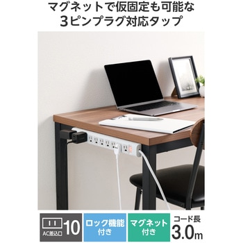 プロジェクターやモニターなどの3ピンプラグ機器を、アダプターなしで接続できる3ピンプラグ対応タップです。抜け止め機能付きの差込口を10口備え、点灯式一括スイッチと設置に便利な仮固定用マグネットを搭載。雷ガード機能と丈夫なキャブタイヤコードにより、安全に使用できます。3ピン-2ピン変換アダプター(アース線付き)が付属しています。