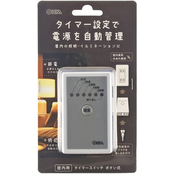 ボタンを押すだけで簡単に設定できる、屋内用タイマースイッチです。30分・1時間・2時間・4時間・8時間のタイマー設定が可能です。繰り返しモードに設定すると、24時間後に自動で再稼働します。必要な時間だけ電源を入れることで、節電や防犯対策に役立ちます。2秒以上の長押し操作で、常時通電として使用できます。