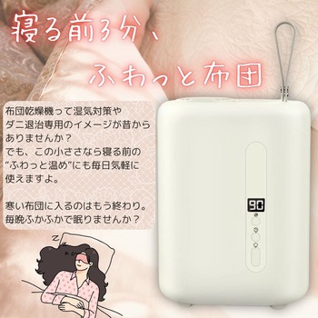 ダニ対策・湿気対策で寝具を衛生的に保つコンパクトな布団ケア機器。B5サイズで収納しやすく、ノズルを差すだけの簡単操作。軽量で持ち運びやすく、多拠点運用や出張先でも活用可能。温めからダニ退治まで1台で対応し、季節を問わず使えます。