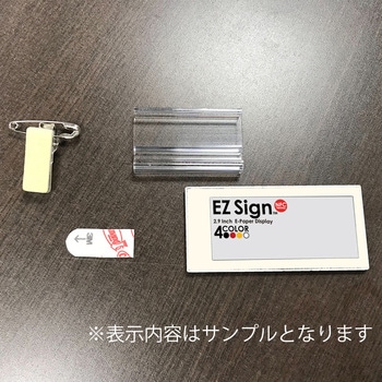 簡単な内容の表示ができる小型モニターです。ブラック、ホワイト、レッド、イエローの4色の表示ができます。専用アプリを使ってお手元のスマートフォンから簡単にデータ登録ができます。充電不要です。専用スタンド、専用両面テープ、専用バッジクリップが付属します。
