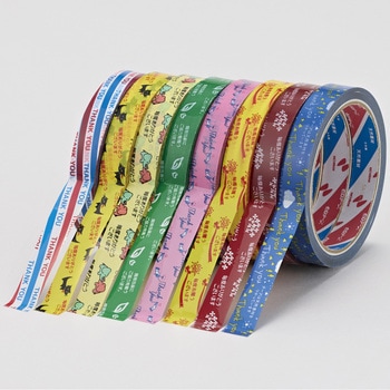既製印刷入りセロテープで、各種の絵柄がそろっています。店舗での包装作業やちょっとした封緘、ラッピングに便利です。バイオマスマーク認定商品(認定番号:200189)。セロハンは天然素材、巻心は再生紙から出来ています。