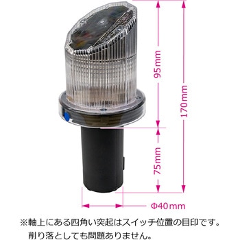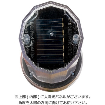 上部が差込可能な穴が開いたタイプのカラーコーン対応の警告灯/保安灯です。斜めになった上面にソーラー発電パネルを内蔵し、裏面のスイッチONの状態で日暮れとともに光センサーが感知して自動的にLEDが点滅(点灯)します。ソーラーパネル充電式なので電池切れや無駄な手間を掛ける必要がありません。