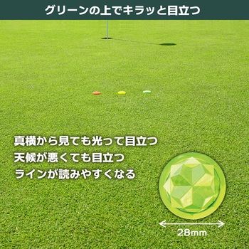 太陽の光を利用してグリーン上でキラッと目立つマーカー。マグネット式なのでクリップへの着脱が簡単!さりげなく施している模様が太陽の光を反射し、プレー中にすぐに見つけられます。マグネット式でクリップへの着脱らくらく。価格を抑えたマーカーのみタイプ(台座なし)。お手元のマーカーの紛失時に代打としても活躍します。