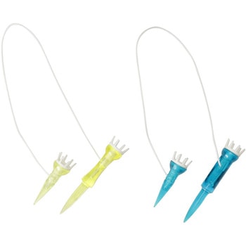 振り抜きの良さとティーアップの安定性を兼ね備えた段付きツインティー。ボールを点で支えるリフトアップ&やわらかヘッドがポイント。インパクト時の抵抗が少ない仕様で振り抜きやすい。段付きなのでいつでも一定の高さのティーアップが可能。ティーが飛びにくいひも付。