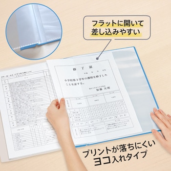 書類を差し込みやすく、落ちにくいヨコ入れ仕様通知表ファイルの収納に最適。プリントが入れやすく、落ちる心配がない横入れタイプ表紙がフラットに開いて差し込みやすい重ねてもかさばらない、背表紙のないスリムタイプ通知表と関連書類を入れるのにちょうど良い10ポケット