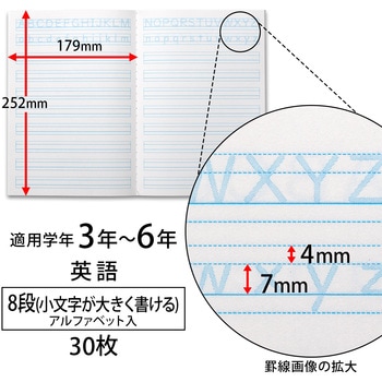 寸法(mm)179×252規格セミB5(学用3号)枚数30枚8段(小文字が大きく書ける)アルファベット入製本糸綴じ科目英語内容量1冊
