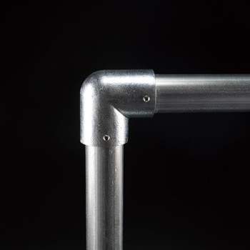 2ヶ所止めで2本の単管パイプをL字ジョイント。平面フレームのコーナーエルボ金具。扉や手すりなどによく使われます。