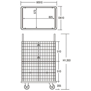 観音扉型金網を上下二段に取り付けた深型タイプの台車です。上下の扉はそれぞれ独立して開閉することができます。開口時の扉は側面に並行するまで大きく開きますので作業の邪魔になりません。扉は上下各2箇所の落とし込み掛け金鍵により確実にロックできます。