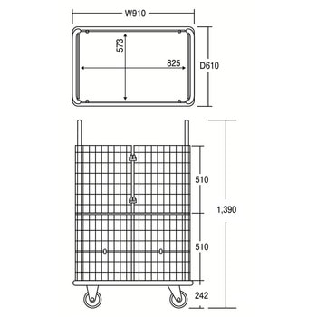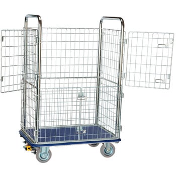 観音扉型金網を上下二段に取り付けた深型タイプの台車です。上下の扉はそれぞれ独立して開閉することができます。開口時の扉は側面に並行するまで大きく開きますので作業の邪魔になりません。扉は上下各2箇所の落とし込み掛け金鍵により確実にロックできます。