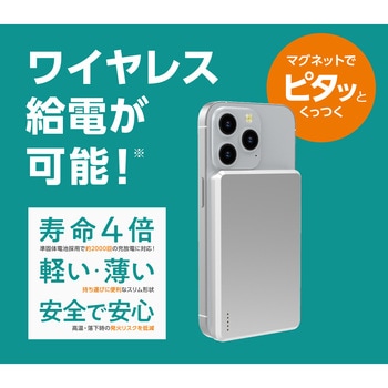 ◎燃えにくく・高耐久の準個体モバイルバッテリーにMagSafe対応品が新発売!〇マグネットでピタッとくっつくワイヤレス給電が可能。〇安全で安心-高温・落下時の発火リスクを低減。〇寿命約4倍-準個体電池採用で約2000回の充放電に対応し長く使える。〇軽い・薄い-厚さ持ち運びに便利なスリム形状。〇PSE技術基準適合商品で飛行機内持ち込み可能で旅行や出張も安心。〇低温・高温に強い- -20~60℃の厳しい環境下にも使用可能。〇LED残量インジケーター付きで残量も一目で確認できます。