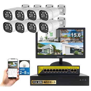 400万画素PoE NVR防犯カメラ8台・録画機8TB付き・15.6インチモニターセット