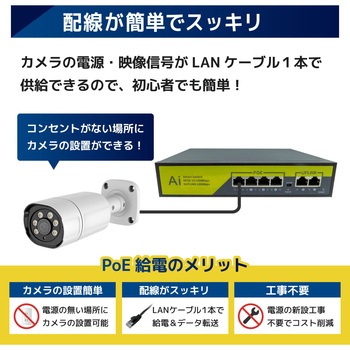 LANケーブル経由で電気を供給するので、電源を取れない場所にもカメラを設置可能で配線がすっきり。(省配線)
