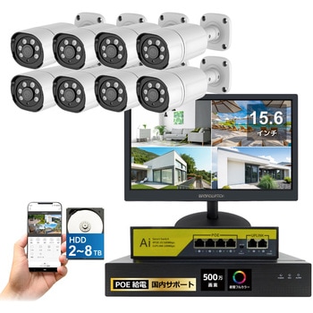用途工場・事務所・倉庫・店舗・駐車場の侵入禁止エリアや厳重警戒エリアで仕様カメラサイズ:約70×60×105mm(本体のみ)、約300g(スタンド含む)、カメラ接続台数:8台(最大8台)、カメラ画素:5M:約500万画素電源カメラ:PoE給電、モニター:DC12V/1A(ACアダプター使用)、DC12V/2A(ACアダプター使用)最大解像度モニター:1920×1080pixel表示色モニター:1.677万色動作環境カメラ:温度-10℃~50℃※但し、結露なきこと、モニター:温度:0~50℃、湿度:10~80% ※但し、結露なきこと、レコーダー:温度 0℃~40℃ ※但し、結露なきこと出力信号100BASE-T(PoE)モニターサイズ15.6inch、約375×300×180mm(スタンド含む)、約1.0kgハードディスク内蔵型3.5INCH 8TB内容量1セット