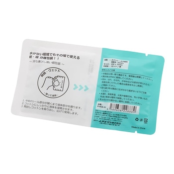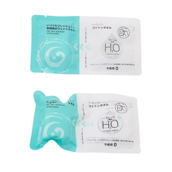 しっとりと柔らかい生地を使用しています。袋は乾いたコットンと水のパウチに分かれており、開封前に水のパウチを強く押すことでコットンを水に浸すことが出来ます。使用直前に水に浸すので、保管時に乾いてしまうことがありません。袋のままタオルウォーマーで温めることも可能です。