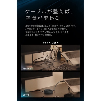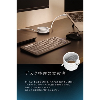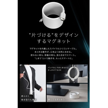 ケーブルに内蔵した磁石の力で、ケーブル同士がくっついて、コイルケーブルのようにスパイラル状にきれいにまとまります。2mの長さがありますが、余分なケーブルが気になったら、くるっと巻くことで、お好きな長さで使えます。ケーブルの収まりがよいだけでなく、使わない時の整頓性や、片付けが劇的に楽になります。