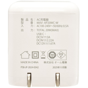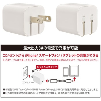 家庭用コンセントからUSB Type-C機器を充電できるPD対応AC充電器です。