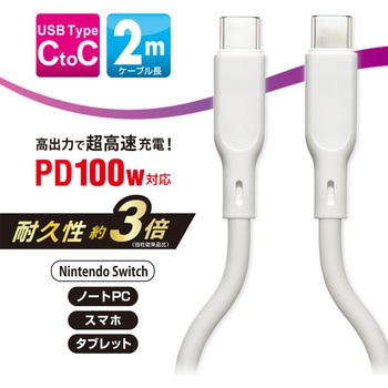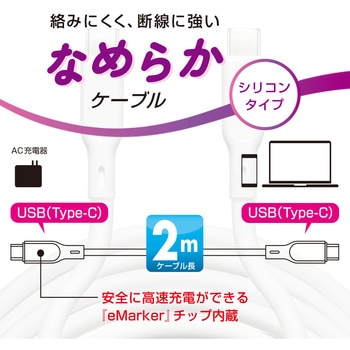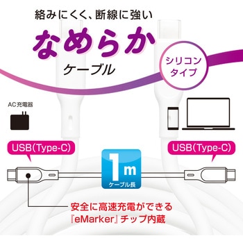 シリコン素材を採用し、柔らかくなめらかな手触りのUSBケーブルです。絡みにくく断線に強い構造で、メーカー従来品より耐久性を向上させています。最大20V/5A/100Wの高出力に対応し、超高速充電が可能です。安全に高速充電ができるeMarkerチップを内蔵しています。結束バンド付きで、持ち運びや収納に便利です。