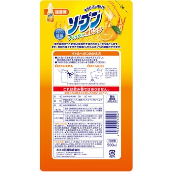 豊かな泡立ちと力強い洗浄力で油汚れをスッキリ落とします。泡切れが良くすすぎが簡単です。さわやかなオレンジの香り。オレンジオイル配合。スポンジ除菌。