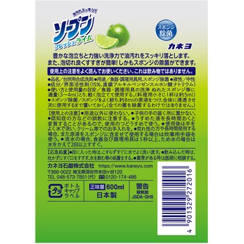 豊かな泡立ちと力強い洗浄力で油汚れをスッキリ落とします。泡切れが良くすすぎが簡単です。さわやかなライムの香り。スポンジ除菌。