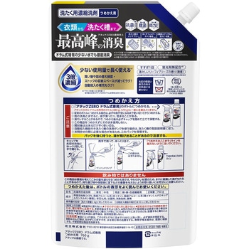 片手でかんたん計量のワンハンドタイプ。衣類から洗たく槽まで、アタックZERO液体史上、最高峰の消臭。ドラム式洗たく機の少ない水、たたき洗いのための専用設計。