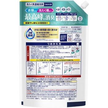 片手でかんたん計量のワンハンドタイプ。衣類から洗たく槽まで、アタックZERO液体史上、最高峰の消臭。イヤな部屋干し臭も24時間防ぎます。