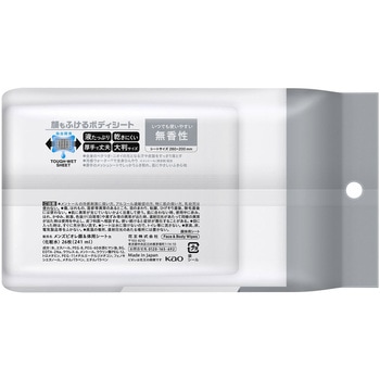 液たっぷり乾きにくい!大判!顔も体もこれ1枚!顔もふけるボディシート。全身のベタつき・ニオイの元となる汗や皮脂をすっきり落とす。厚手のメッシュシートでしっかりふきとれ、肌にやさしいふき心地。メントール(清涼剤)配合。いつでも使いやすい無香性。