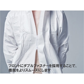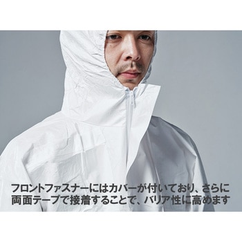 正面には水・油など液体からのバリア性の高い生地(SF)を採用し背面には通気性を兼ね備えた生地(SMS)を採用することで、防護服内の蒸れを軽減し、快適な着心地を実現します。