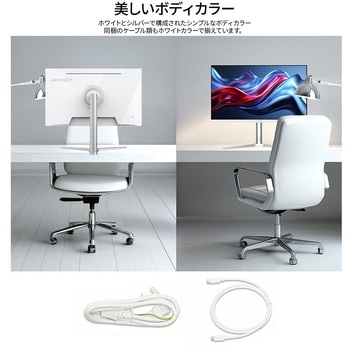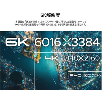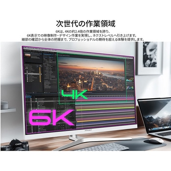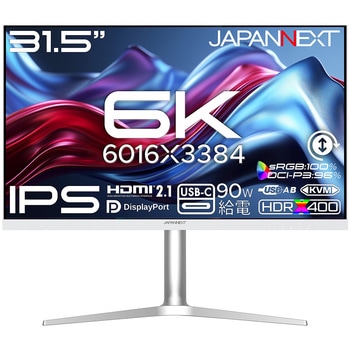 31.5インチのIPSパネルを搭載した、6K(6016×3384)解像度の液晶モニターです。5Kや4Kを超える広大な作業領域を提供し、4K動画を表示しながら編集ツールやタイムラインを同一画面内に配置できます。高精細なピクセル密度により文字や細部の輪郭がより滑らかに表示されます。最大輝度500cd/m2、sRGB:100%、DCI-P3:96%の広色域、HDR400相当の性能を持ちます。本体カラーにホワイト、スタンドにはシルバーカラーを採用。高さ調整が可能なスタンドを搭載、回転、スイーベル機能にも対応。インターフェイスは?HDMI 2.1×2、DP、USB-Cを搭載。USB-C(最大90W給電)は、対応のPCであればUSB-Cケーブル1本でモニターへの映像出力とノートPCへの給電が可能。KVM機能に対応。モニターに接続したキーボード、マウスをデスクトップPCやUSB-C接続のPCで入力を切り替えた際にもそのまま使用可能です。複数の入力を同時に表示する「PBP(Picture by Picture)」に対応、2つの入力映像を左右同時に表示可能。入力の一つを子画面にて表示する「PIP(Picture in Picture)」も可能です。75×75mm?の?VESA?マウントに対応。?2W×?2のスピーカーを搭載。本製品には、2年間のメーカー保証が付きます。